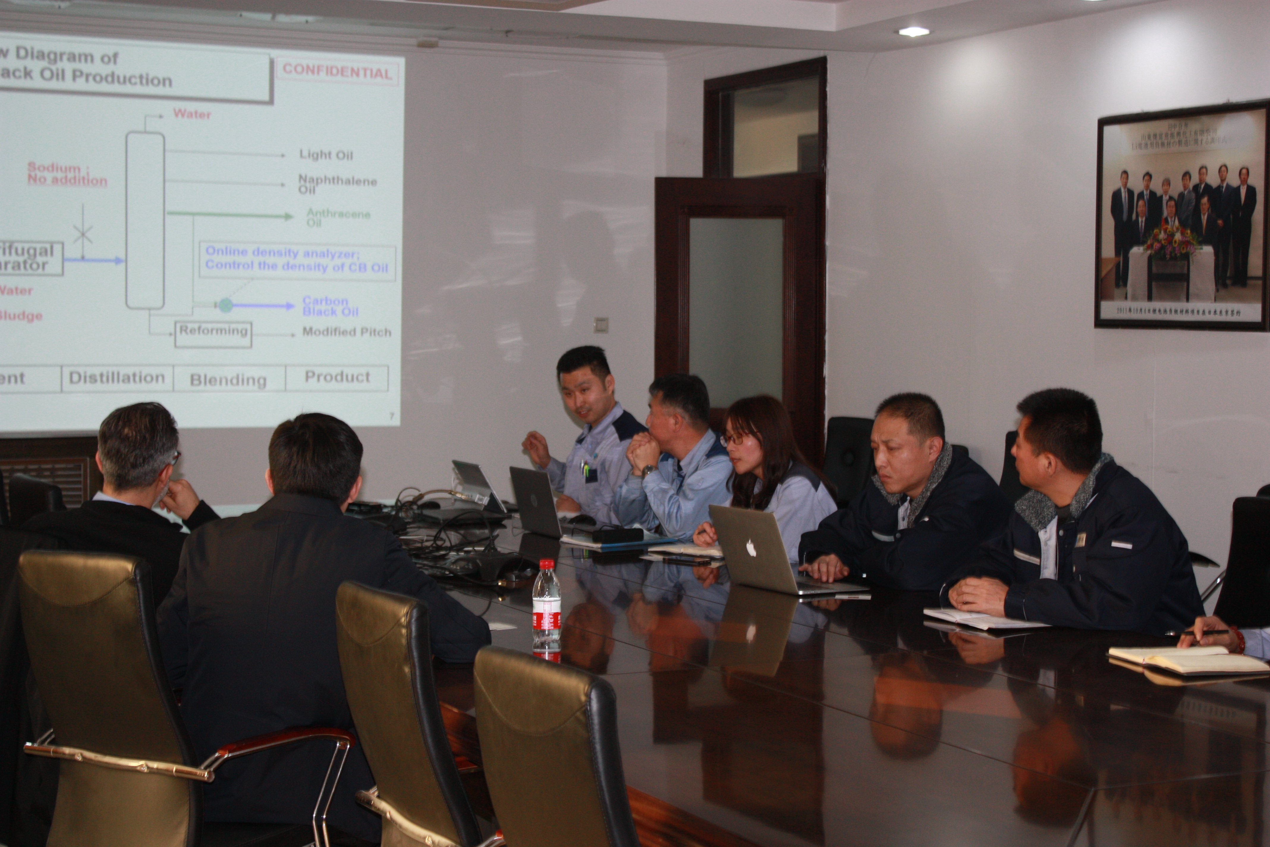 Cottrell Todd一行首先在會議室進行座談,詳細了解杰富意公司基本情況,主導(dǎo)產(chǎn)品組成架構(gòu),焦油、炭黑油、蒽油等炭黑原料油的成分比例、數(shù)量等情況及后期炭黑的市場預(yù)測、炭黑原材料市場趨勢等。并依據(jù)山東杰富意公司和棗莊杰富意公司實際制定了較為詳細的國內(nèi)炭黑油和蒽油的銷售方案,對蒽油出口印度博拉工廠的設(shè)想達成了共識。隨后,Cottrell Todd一行到現(xiàn)場進行了實地參觀,對炭黑油、蒽油的質(zhì)量把控、庫存量、裝車設(shè)施、計量設(shè)施進行詳細了解,對企業(yè)的發(fā)展給予認可。博拉炭黑方表示,作為老客戶將在2020年建立更加穩(wěn)固的戰(zhàn)略合作關(guān)系。